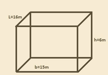 Volume of rectangle =(LxBxH)=16x15x6=1440m3